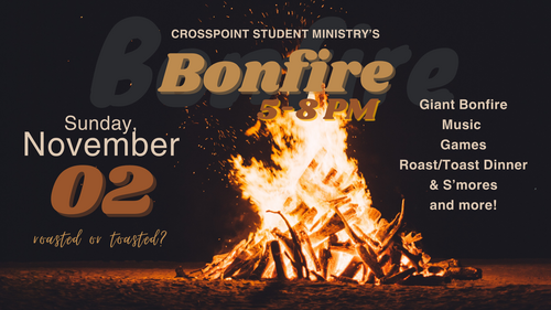 Come on out to Pastor Jess' house for a rip roaring bonfire! Along with a  place to roast marshmallows, eat smores, play games and more! Dress warm and have a great time! Seating is limited so a chair is sugguested.