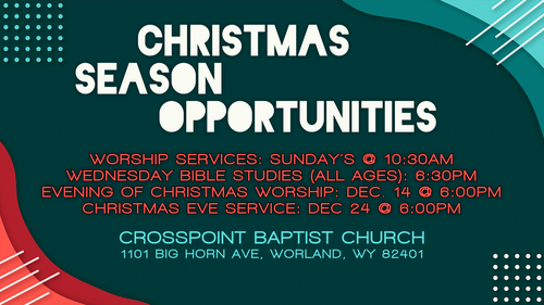 CrossPoint Baptist Church (Worland, WY) is a place where people can meet Jesus, engage in life-giving community, and everyone is welcome. We believe in creating a space where people can have authentic encounters with Christ, discover their gifts and use them for God's glory. We want help people find and follow Jesus! We want you to be connected: whether it's Sunday mornings, Wednesday evenings or the plenty of other opportunities that take place throughout the year. We hope to see you here soon!